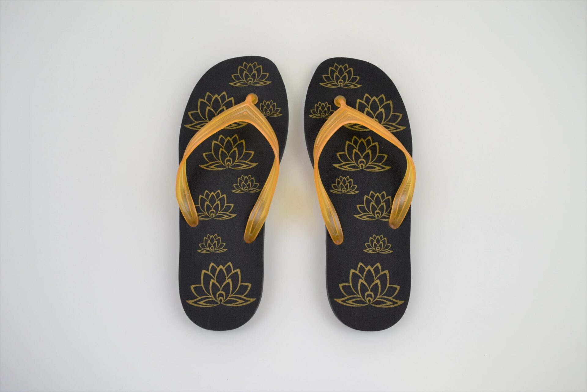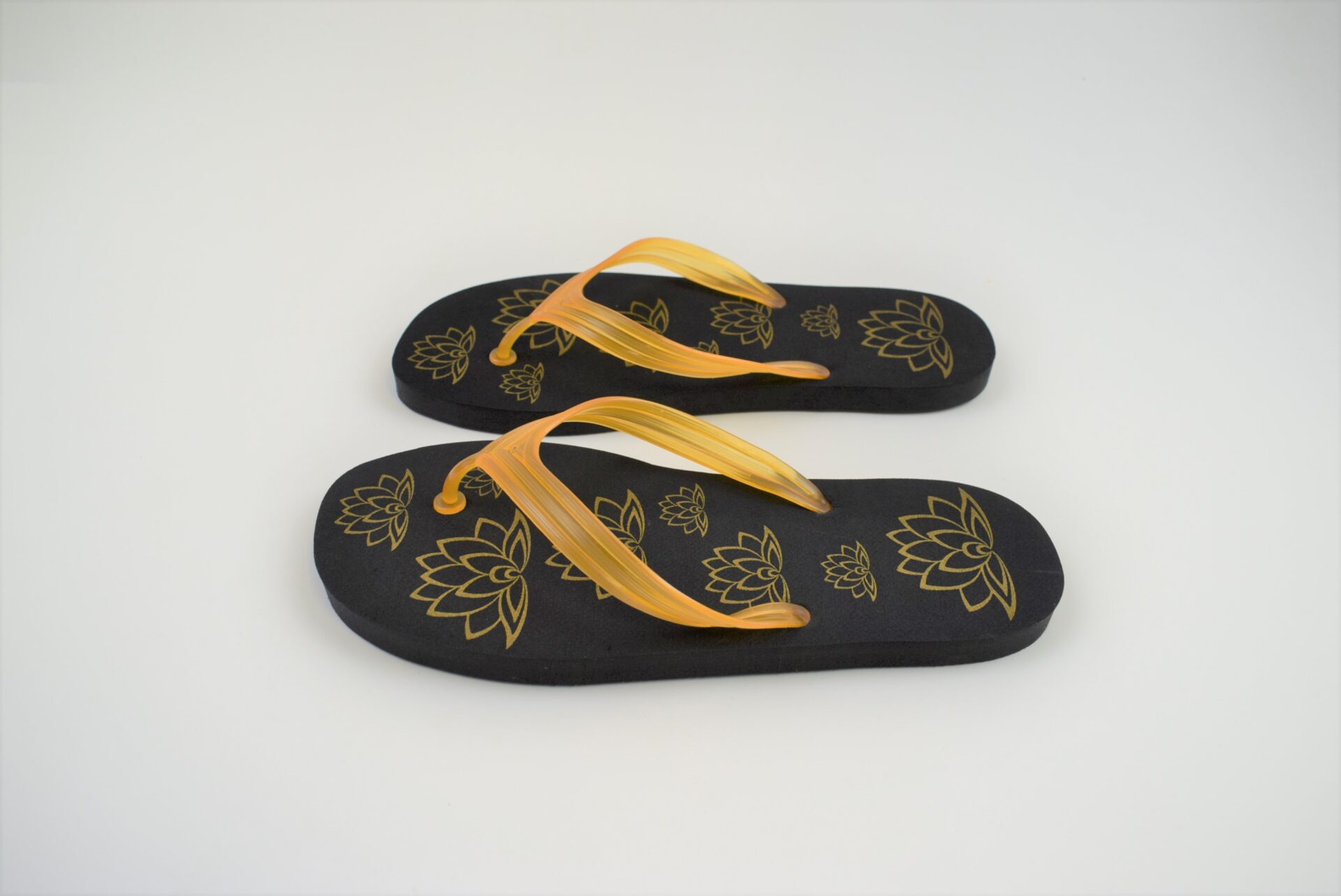 Yoga flip flops realized with certified eva foam material and 100% Made in Italy. White upper (different version: orange upper). Totally customizable with names and logos.