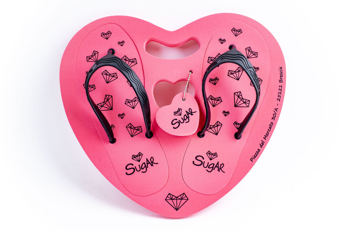Se lavorate per una agenzia di comunicazione che è alla ricerca di articoli promozionali un po’ più elaborati o siete wedding planners, quello che vi proponiamo è una tavolozza di ciabatte a forma di cuore con tanto di portachiavi abbinato. Il materiale EVA si presta benissimo ad una personalizzazione del prodotto con logo o nomi tramite serigrafia.