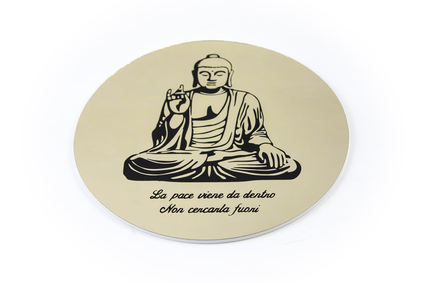 “La pace viene da dentro. Non cercarla fuori”. Buddha specchio con pellicola riflettente realizzato in gomma crepla certificata e 100% Made in Italy. Personalizzazione ad hoc del prodotto con stampa di nomi e loghi.