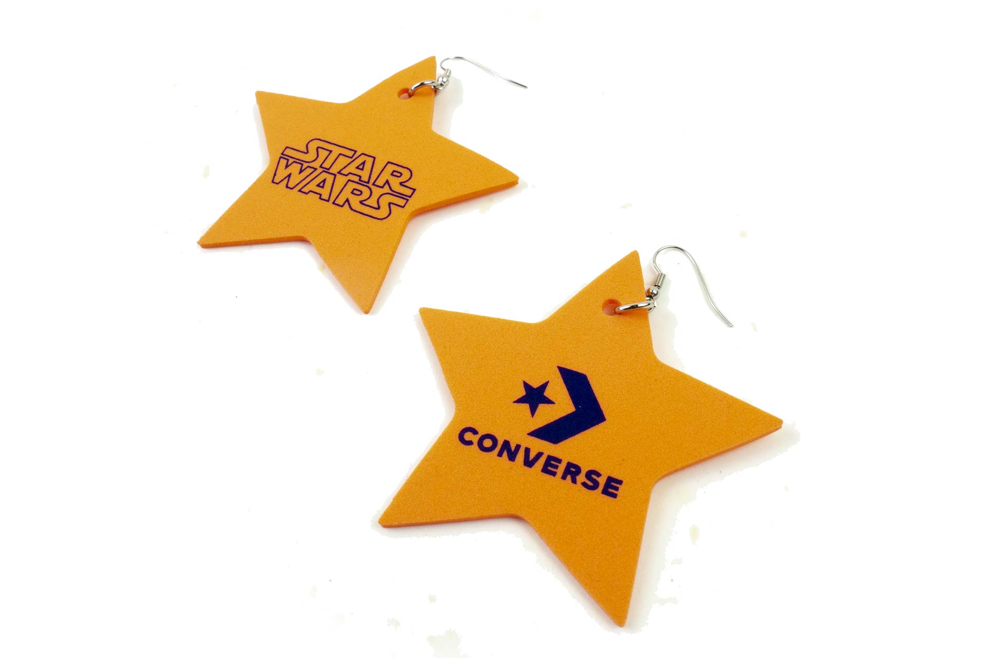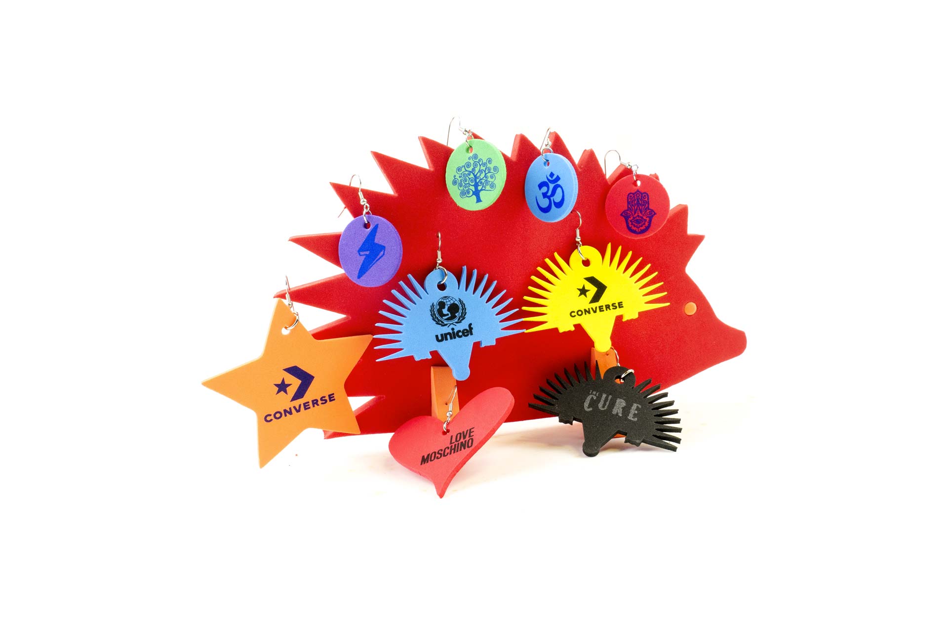 Orecchini promozionali realizzati in gomma eva certificata, conosciuta anche come gomma crepla o fommy, 100% Made in Italy. Personalizzazione ad hoc del prodotto con stampa di nomi e loghi. Possibilità di realizzare anche nuove sagome.