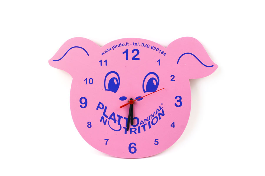 Orologio a forma di maiale realizzato in gomma eva certificata e 100% Made in Italy. Personalizzazione ad hoc del prodotto con stampa di nomi e loghi.