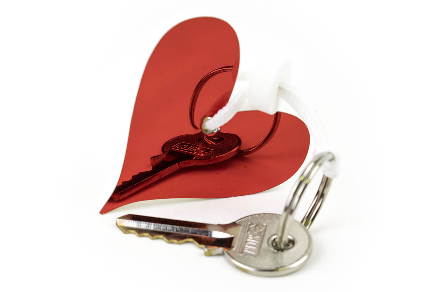 Portachiavi a forma di cuore con pellicola riflettente. Gomma EVA certificata, materiale atossico e 100% made in Italy.