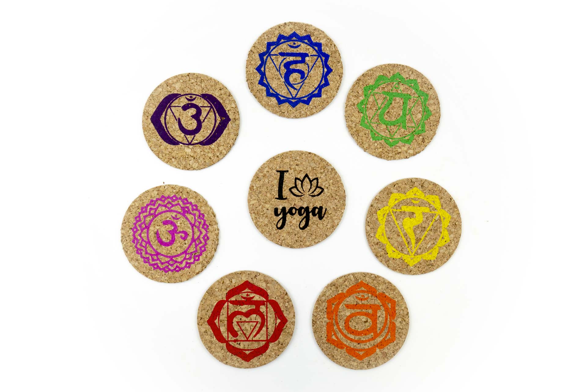 Sottobicchieri yoga con chakra stampati in serigrafia. 100% Made in Italy. personalizzazione ad hoc del prodotto con stampa di nomi e loghi. Possibilità di creazione di nuove sagome.