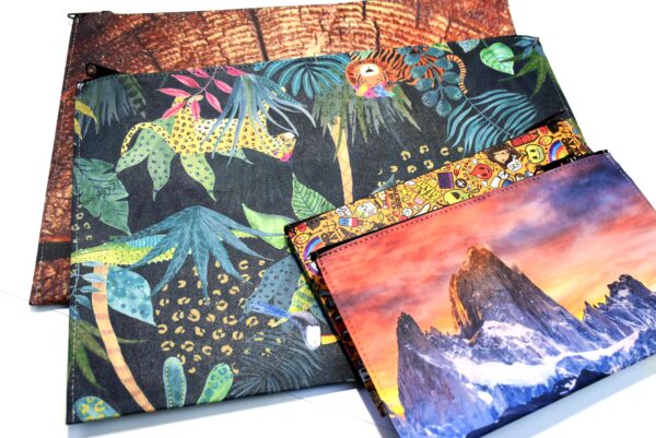 Astucci digitali con cerniera realizzati in fibra di cellulosa. Personalizzazione ad hoc del prodotto con stampa di nomi e loghi aziendali.