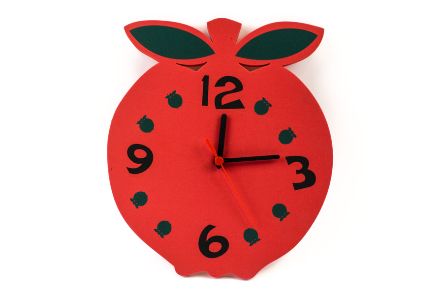 Orologio Mela da parete realizzato in gomma eva certificata e 100% made in Italy. Personalizzazione con stampa di nomi e loghi aziendali.