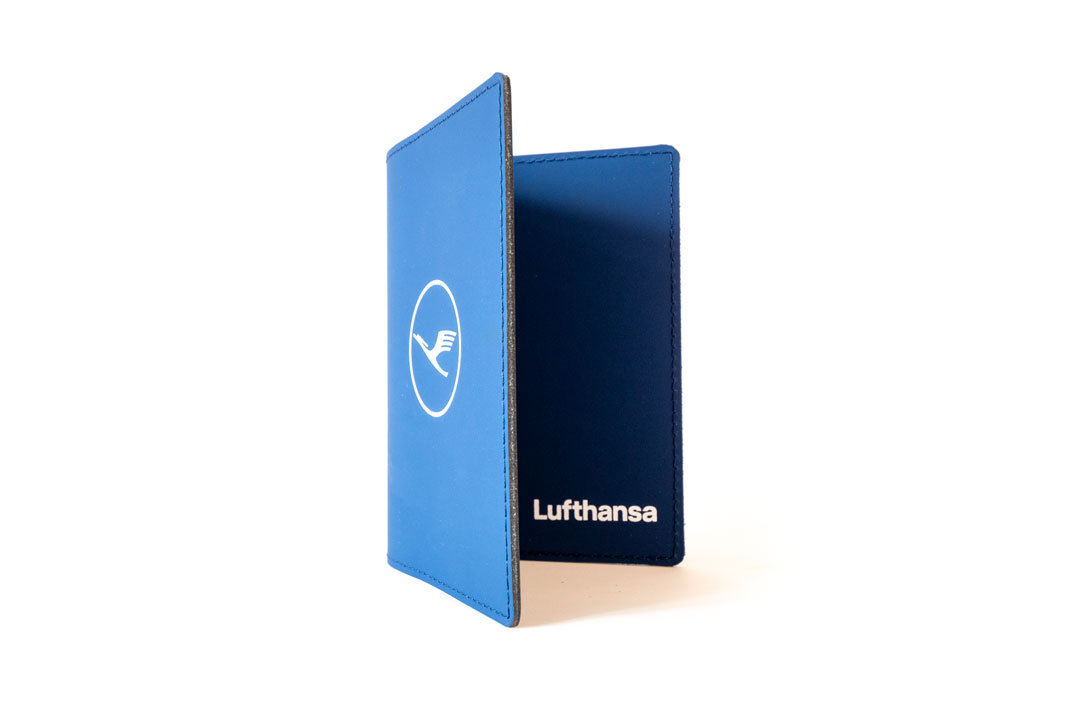 Porta Passaporto Lufthansa realizzato in cuoio rigenerato. 2 Tasche interne. Cucito.