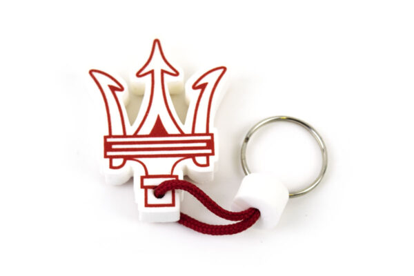 Portachiavi a forma di logo Maserati realizzato in gomma EVA certificata e 100% made in Italy. Personalizzazione ad hoc del prodotto con stampa di nomi e loghi aziendali. Possibilità di creare nuove sagome.