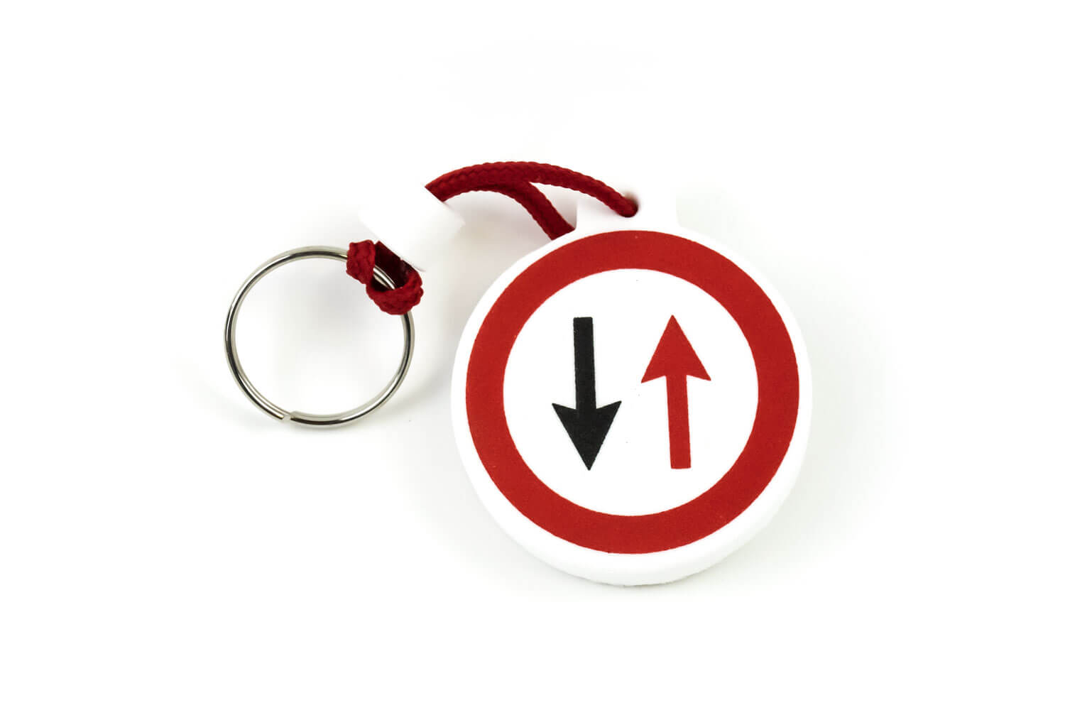 Portachiavi rotondo a forma di segnale stradale di precedenza realizzato in gomma EVA certificata e 100% made in Italy. Personalizzazione ad hoc del prodotto con stampa di nomi, loghi aziendali e delle scuole guida. Forme diverse in base al cartello stradale.