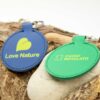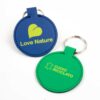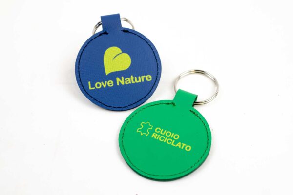 Portachiavi tondo realizzato in cuoio rigenerato 100% Made in Italy. Personalizzazione ad hoc del prodotto con stampa di nomi e loghi aziendali.