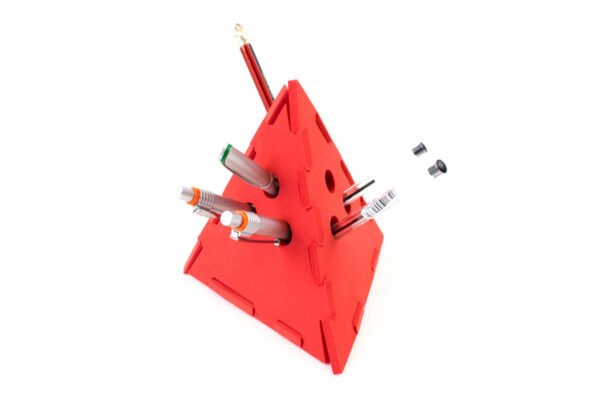 Portapenne Piramide realizzato in gomma eva certificata e 100% Made in Italy. Personalizzazione ad hoc del prodotto con stampa di nomi e loghi aziendali.